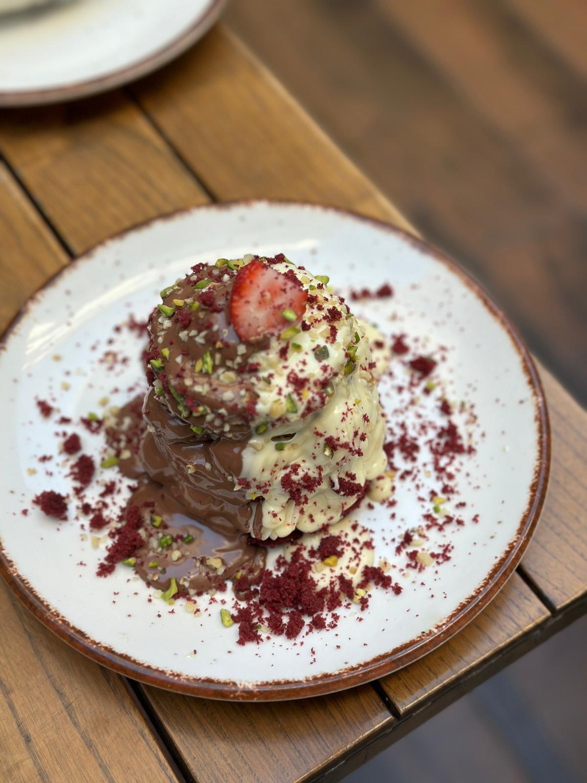 Redvelvet keki özel kreması çilek muz ve beyaz belçika çikolatası ile servis edilir