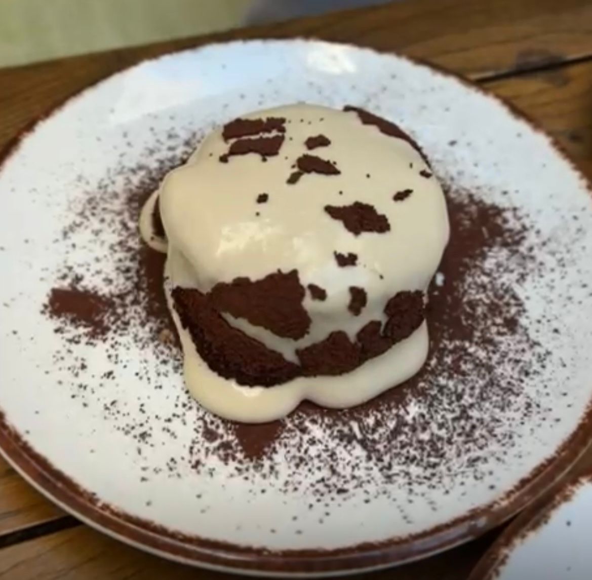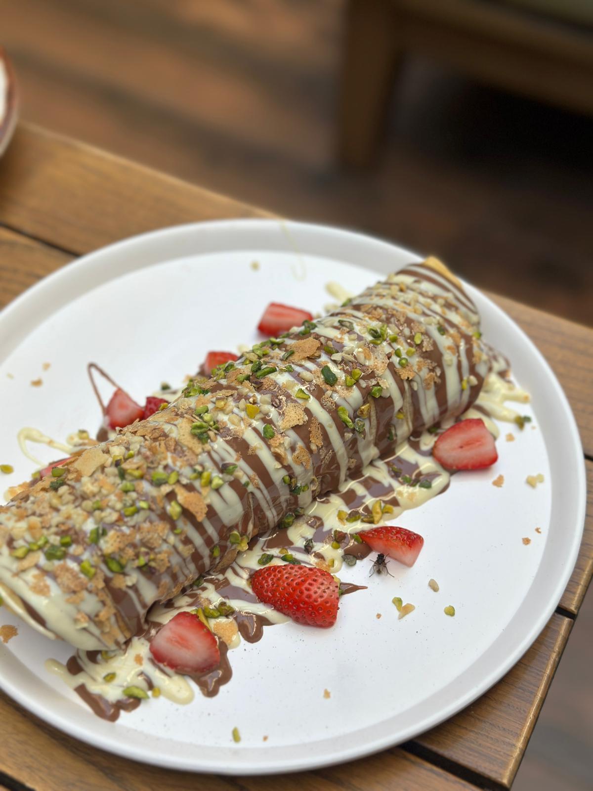 Kase altında devis kek üzerine vanilya ve belçika çikolatası ile hazırlanan kreması içerisinde fıstık ve parça çikolata en üstte sütlü belçika çikolatası ile servis edilir.