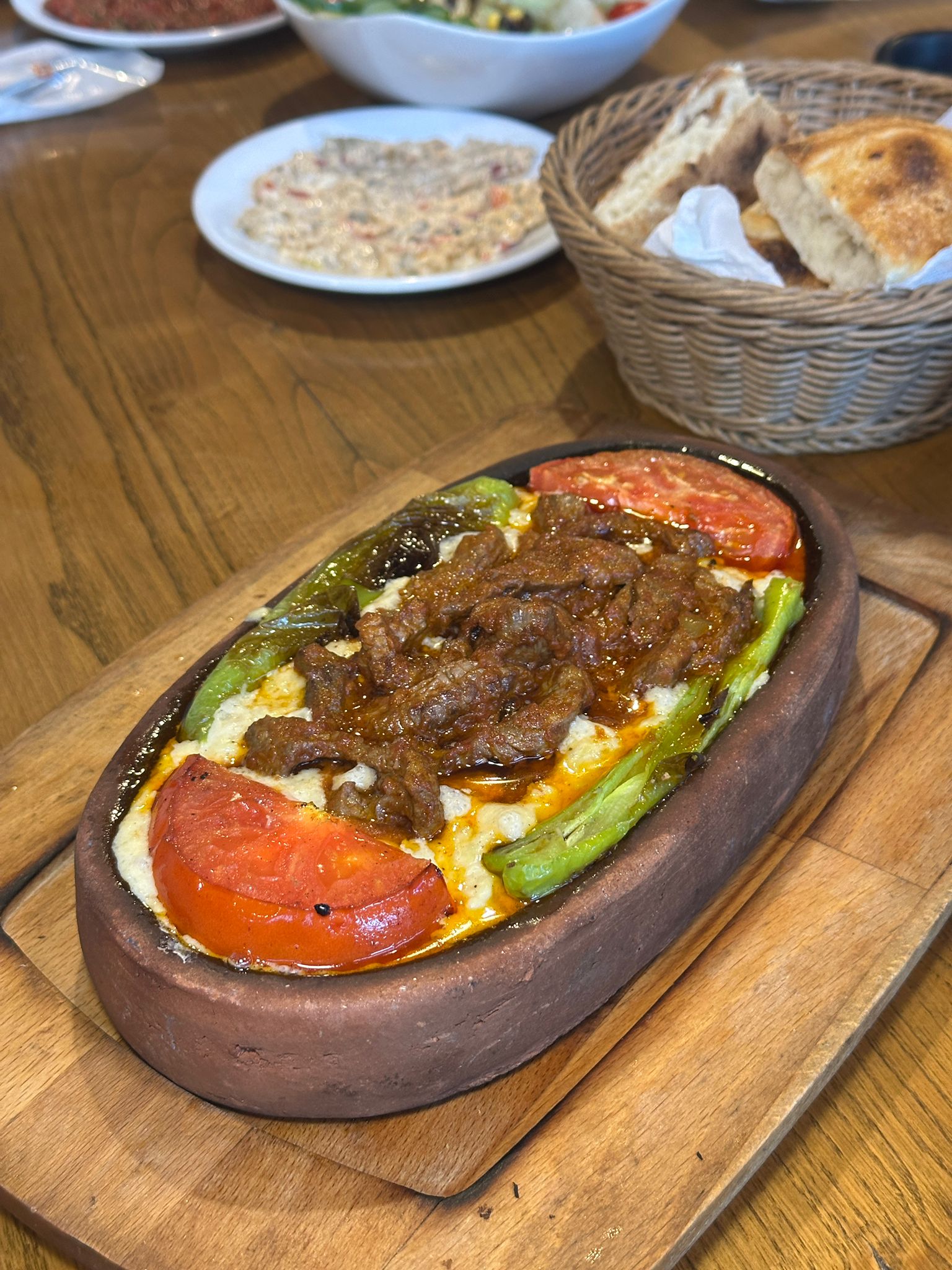 Közlenmiş patlıcanın sarımsaklı yoğurtla karıştırıldığı hafif bir taban üzerine sade kıyma ile yapılır, Az çorba 4 çeşit meze ve salata ile servis edilir.