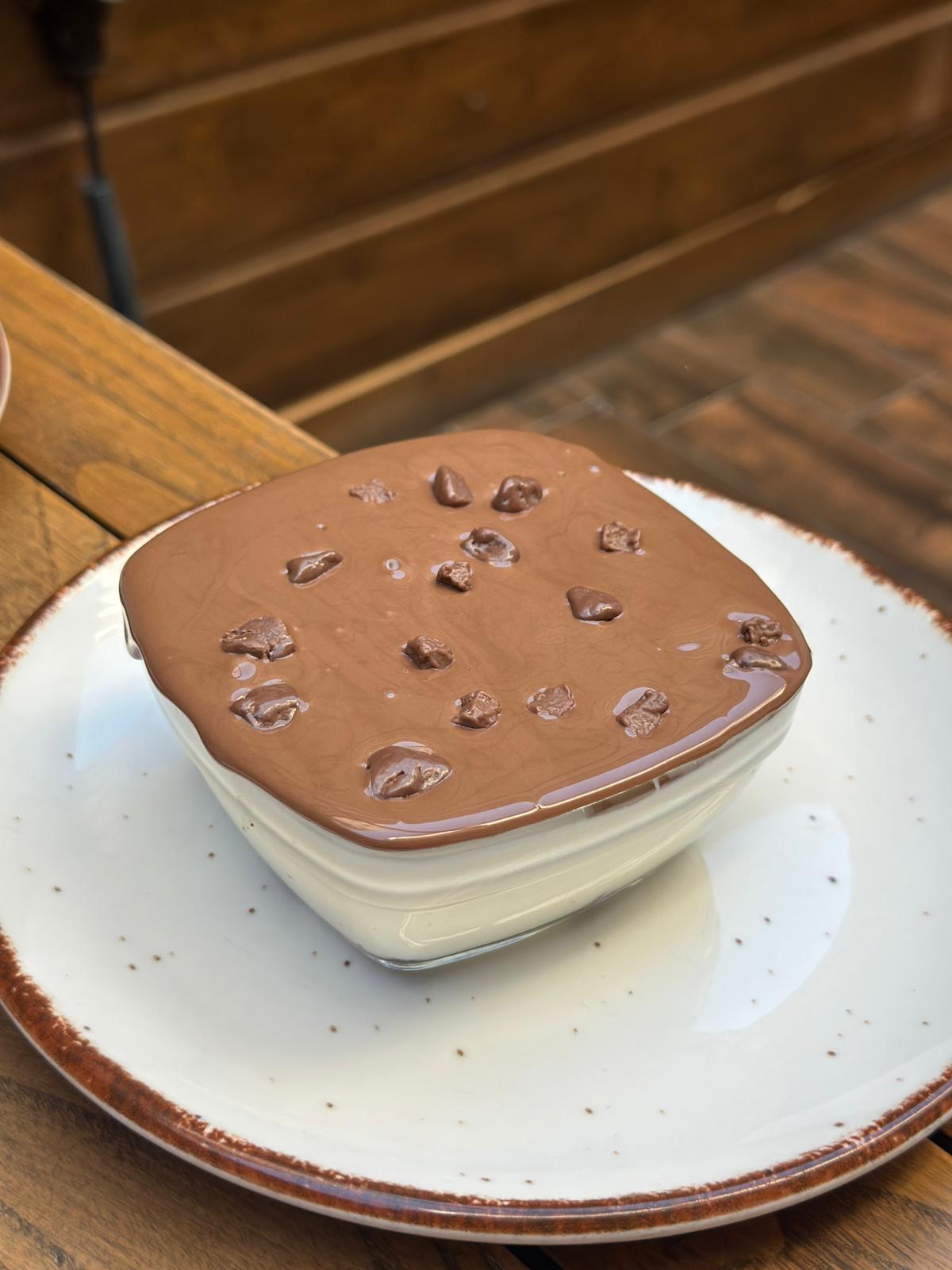 Kase altında devis kek üzerine vanilya ve belçika çikolatası ile hazırlanan kreması içerisinde fıstık ve parça çikolata en üstte sütlü belçika çikolatası ile servis edilir.